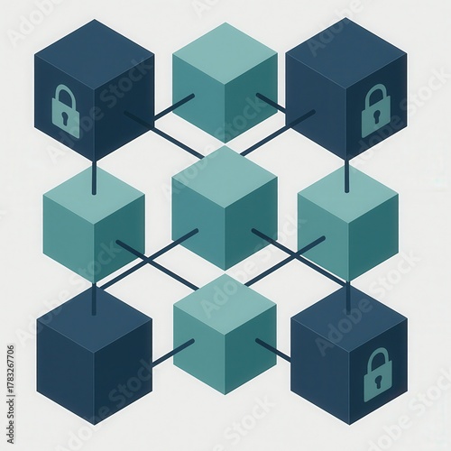 Innovative blockchain security architecture featuring interconnected cubes with padlock symbols representing data encryption and cybersecurity integrity captured with clarity