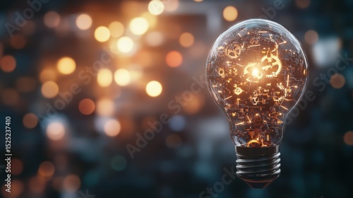 Innovative concept of a light bulb containing mechanical gears and glowing circuit lines representing futuristic ideas