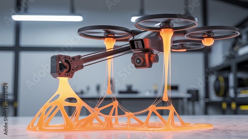 Innovative Drone Technology: A cutting-edge drone, poised for flight, showcases advanced technology and design within a modern workspace, the image exudes technological innovation and precision.
