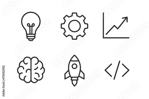 icon, innovative, light, bulb, gear, chart, brain, rocket, coding, technology, design, idea, creativity, progress, development, innovation, symbol, line, graphic, illustration, concept, solution, advancement, startup, intelligence, diagram, interface, growth, programming, launch, strategy, minimal, modern, business, plan, success, icon, vector