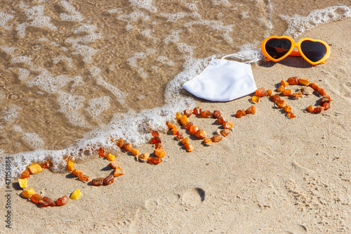 Inscription Covid-19 made of amber stones, protective mask and sunglasses on sand at beach. Holidays and safe during coronavirus