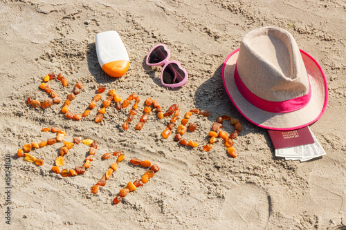 summer, sunglasses, lotion, sunblock, leghorn, passport, document, identification, cash, money, dollar, vacation, travel, sand, beach, coast, sea, amber, stone, relaxation, leisure, holiday, tour tourism, sun tanning, protection, sunny, sunshine, inscription