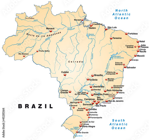 brazil, card, information, limit, map, cartography, geographic, background, outline, vector, tour tourism, travel, travel, america, south america, atlantic, atlantic, ocean, body of water, amazon, natal, el salvador, rio, paulo, postage, orange