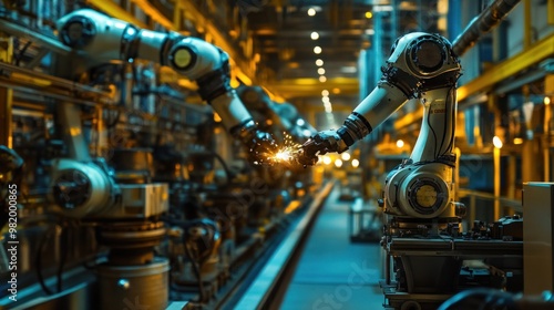 Inside a clean energy facility, robotic welding arms are at work, securing pipelines for an NLG energy project, blending traditional fuel production with green energy solutions.