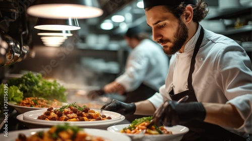 Inside a gourmet restaurant, chefs are cooking a variety of authentic delicacies, attracting diners from all over the country. Generative AI.