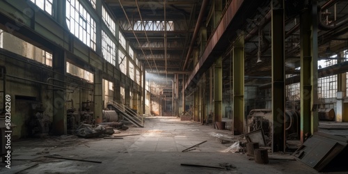 Inside view of an abandoned factory. Generative AI image