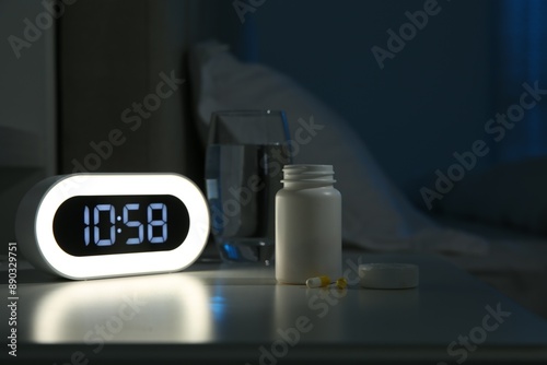 Insomnia treatment. Alarm clock, glass of water and pills on bedside table in bedroom at night