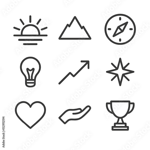 inspirational, icon, grid, outline, set, quote, sunrise, silhouette, mountain, peak, compass, light bulb, idea, rising, arrow, starburst, nubes, open, hand, trophy, line, icon, only, black, colours, consistent, stroke