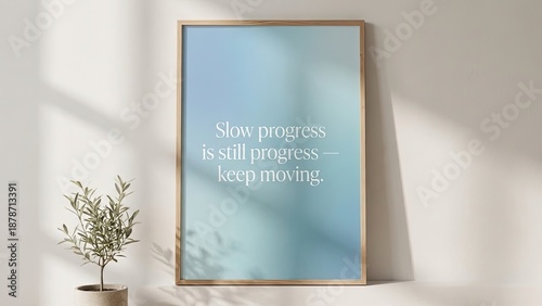 Inspirational Quote Poster With Gradient Background and Wooden Frame, Promoting Slow Progress And Continuous Movement.