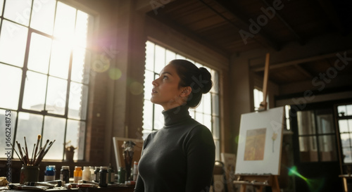 artist, studio, woman, creative, art, painter, hopeful, inspiration, young, female, hobby, lifestyle, creativity, workshop, sunlight, window, natural light, looking up, portrait, canvas, art supply, passion, occupation, career, craft, modern, bright, indoor, one person, freelancer, entrepreneur, thinking, dreaming, vision, future, inspired, pensive, turtleneck, loft, industrial, hispanic, mixed race, half face, photo, person, 1, composition, copy space