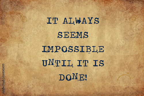 Inspiring motivation quote of it always seems impossible until it is done with typewriter text. Distressed Old Paper with Typing image.