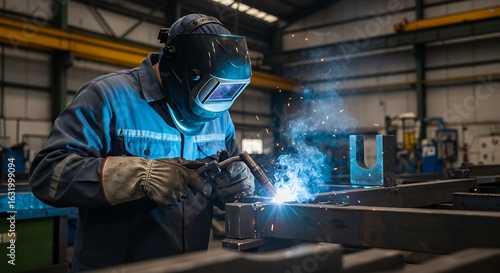 welder, welding, men at work, working, factory, industrial, industry, manufacturing, metal, steel, spark, light, arc, blue, hot, heat, construction, man, professional, skill, skilled, trade, craft, craftsmanship, equipment, tool, torch, mig, helmet, mask, safety, protection, glove, uniform, metalwork, fabricator, job, occupation, labor, manual, heavy, beam, iron, structure, smoke, energy, power