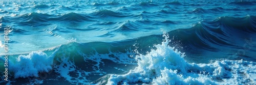 Intense blue, rough sea surface; visible foam , deep, wave texture