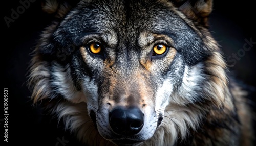 Intense close up portrait of a majestic wolf with piercing yellow eyes against a dark background
