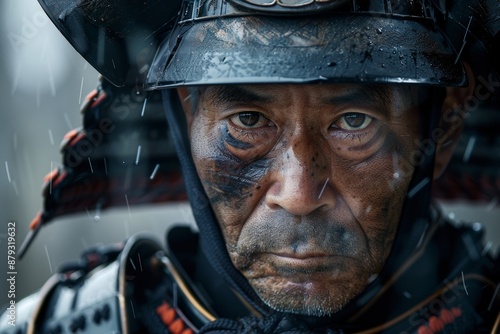 Intense close-up of weathered athlete in helmet, rain falling, determined gaze.
