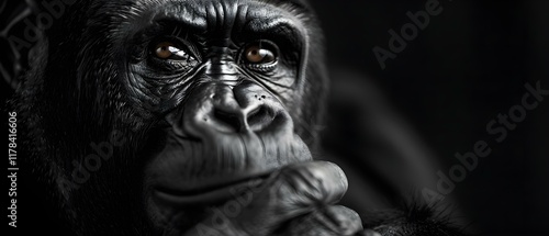 Intense Close-Up Portrait of a Thoughtful Gorilla in Monochrome Lighting