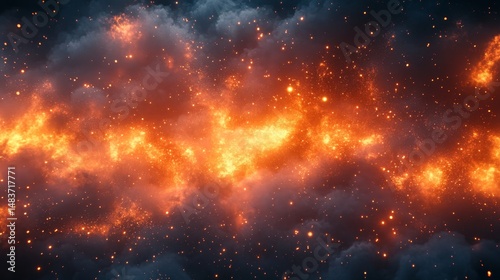 Intense fire explosion with glowing particles and thick smoke on dark background.