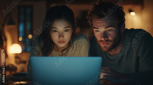 intense gaze of a couple working late night on a laptop in a softly lit room showing dedication and focus