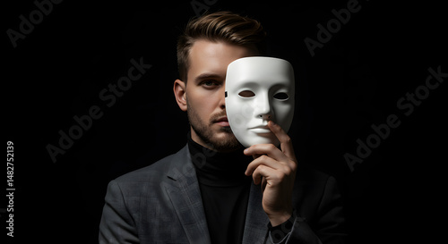 man, mask, portrait, suit, face, person, male, identity, hidden, mystery, secret, dark, shadow, masquerade, disguise, concealment, businessman, elegance, formal, confident, stylish, clothing, attire, indoor, studio, serious, one person, adult, fashion, style, black background, modern, attractive, photogenic, young, individual, expression, drama, symbol, european, caucasian, professional, unrecognizable, corporate, concept, hiding