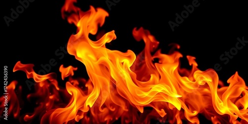 Intense orange and yellow flames against a black background, fireplace, fire design