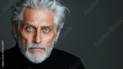intense portrait of a distinguished elderly man with grey hair and beard on dark background