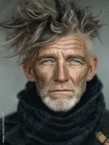 Intense portrait of a weathered individual with piercing blue eyes and windswept grey hair, showcasing strength and character.