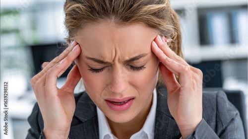 pressure, filtered, cephalalgia, pain, suffering, stress, tension, distress, mental health, emotion, business, portrait, woman, closed eyes, office, unwell, worried, emotional, frustrated, concerned, overwhelmed, troubled, burden, unhappy, difficulty, problem, symptom, disease, anxiety, frustration, anguish, heartache, grieved, discomfort, ache, weary