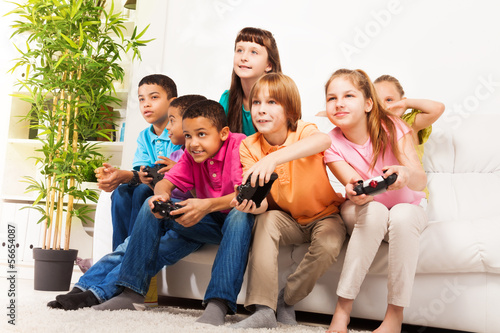 to sit, sofa, children, children, children, children, many, group, friends, friends, cheerful, indoor, people, kindergartner, cute, smiling, white, casual attire, boy, boy, girl, girl, caucasian, sister, brother, 10, lifestyle, play, playing, game, gaming, video game, team, controller, couch, fun, joystick, console, entertainment, control, home, computer, expression, gamer, player, video game, equipment