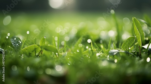 Intensely green grass in close up with garden background beautifully blurred in the distance