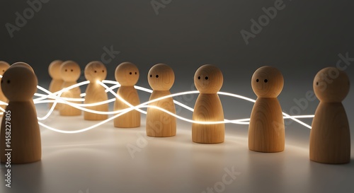 connection, network, communication, community, social, media, cyberspace, technology, digital, online, human relationships, interaction, group, team, people, figure, wooden, light, glow, illuminated, dark, background, abstract, concept, symbolic, oneness, togetherness, link, bond, sharing, information, datum, flow, energy, power, design, art, minimal, modern, simple, shape, form, pattern, texture, smooth, wood, grain, shadow, perspective