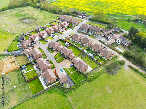 Interesting top down view of a drone showing a new housing development in rural Britain. Some of the houses are affordable housing and some, the larger ones are private properties.