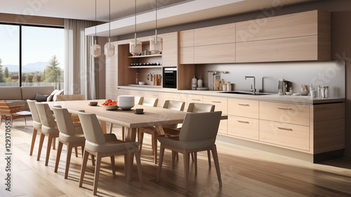 Intérieur d'une cuisine américaine, ouverte sur le salon. Lumière extérieure. Cuisine luxueuse, comptoir et meuble en bois clair. Conception et création graphique.