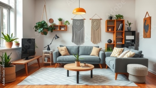 Interior design, cozy living room, modern furniture, gray sofa, wooden shelves, hanging plants, wall art, macrame wall decor, warm color accents, patterned rug, pendant lamp, hygge style