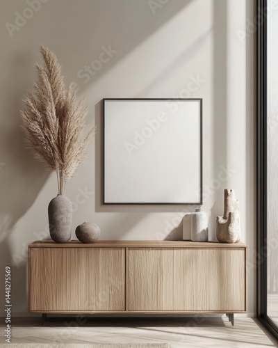 Interior design with blank frame on wall above wooden cabinet with decorations and pampas grass