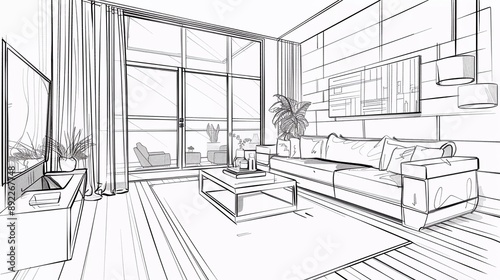 Interior design with modern living room in black line sketch on white background, very beautiful vector illustration