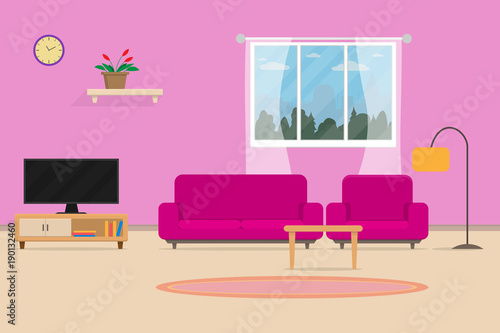 cosy, design, background, flat, cartoon, window, home, room, living, furniture, comfortable, purple, pink, television, television, colourful, large, cabinet, book, inside, interior, luxury, luxurious, lamp, view, sky, landscape, clock, shelf, desk, table, flower, pot, curtain, carpet, sofa, domestic, colours, lifestyle, chair, wall, style, indoor, decor, modern, decoration, apartment, house, vector, illustration