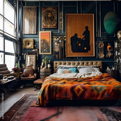bed, bedchamber, hotel, interior, furniture, home, room, luxury, lamp, house, design, comfortable, apartment, decor, light, sleep, nobody, painting, poster