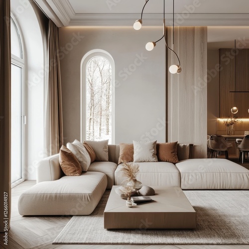 interior, living, room, luxury, design, furniture, sofa, pillow, table, hot drink, rug, window, arch, light, pendant, lamp, wood, hardwood, floor, curtain, beige, neutral, colours, elegant, contemporary, modern, minimalist, vase, plant, decoration, home, apartment, residence, comfortable, cosy, relaxing, bright, airy, roomy, open, plan, dining, chair, artwork, architecture, winter, snow, tree