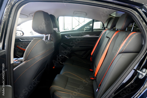 interior, automobile, luxury, black, leather, accent, modern, high technology, sleek, sophisticated, vehicle, car, technology, design, style, quality, performance, lighting, chrome, metallic, grey, luxurious, closeup, inside, seatbelt, headrest, passenger, steering wheel, gearlever, front, rear, buttons, comfortable, safe
