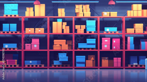 warehouse, interior, box, storage, shelf, organisation, logistic, colourful, inventory, stock, cardboard box, industrial, stockroom, commercial, distribution, neat, merchandise, freight, shipment, container, rack, good, stacked, organised, vibrant, supply, pallet