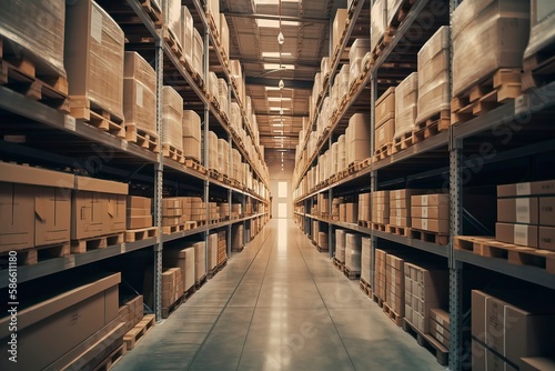 interior of an warehouse full of Spaces and high rising self Where the products are stocked. Generative AI