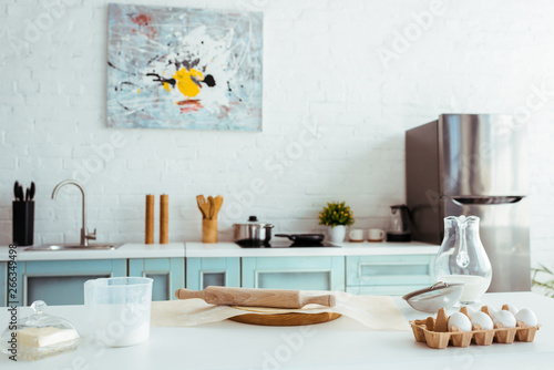 table, nobody, painting, art, uncooked, raw, food, kitchen, wooden, kitchen utensile, drink, preschool, modern, interior, home, milk, furniture, wood, indoor, ingredient, dough, butter, preparing, egg, refrigerator, sieve, copy space, rolling pin