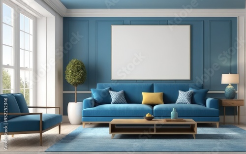 sofa, furniture, apartment, modern, design, indoor, house, blue, luxury, decoration, room, living room, interior, living, home, wall, floor, illustration, decor, white, contemporary, architecture, table, style, empty, background, render, chair, comfortable, couch, lamp, pillow, armchair, copy space, lifestyle, seat, cushion, bright, cosy, lounge, no people, light, wood, three-dimensional, plant, home interior, nobody, horizontal