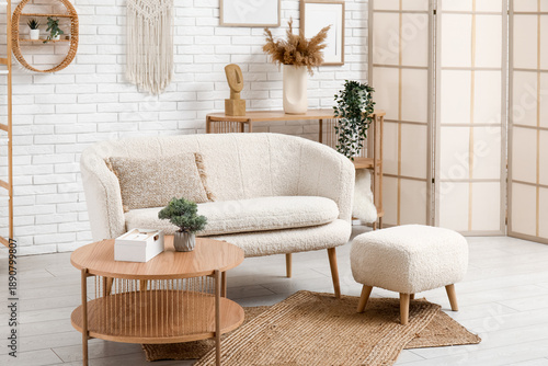 Interior of modern light living room with couch, table, pouf and folding screen