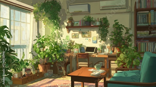 room, plant, sunlight, interior, cosy, desk, bookshelf, chair, green, alive, window, bright, calm, peaceful, book, artwork, open, space, home, living, nature, wooden, table, work, study, vibrant, serene, day, potted, foliage, leaf, air, warmth, aesthetic, clean, airy, cheerful, welcoming, pleasant, detail, illustration, design, light, soft, beautiful, urban, apartment, tranquil