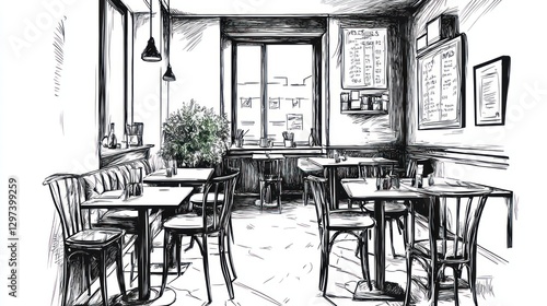 Interior sketch of a cafe, tables and chairs, windows, calm atmosphere, suitable for restaurant design