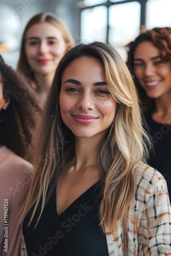 International Women's Day portrait of cheerful multiethnic mixed age range businesswomen celebrating, Embrace Equity, woman diversity.