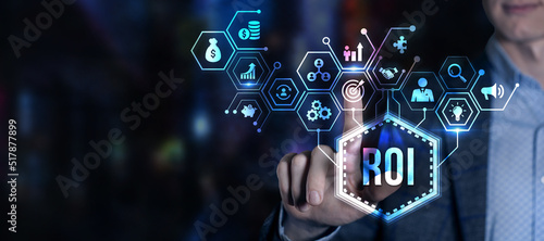 Internet, business, Technology and network concept. ROI Return on investment financial growth concept. Virtual button.
