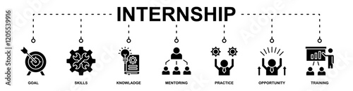 Internship banner web icon vector illustration concept with icon of goal, skills, knowladge, mentoring, practice, opportunity, training