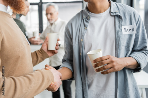 Interracial men with paper cups shaking hands during alcoholics meeting in rehab center.